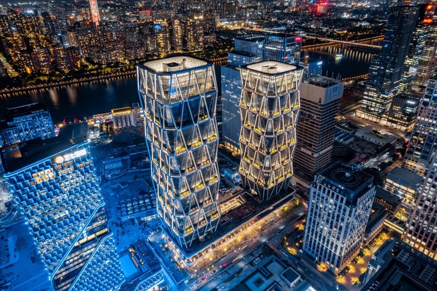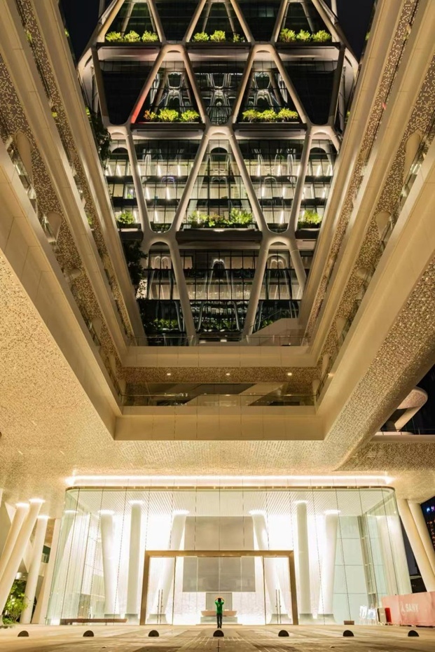这些网格由钢结构柱组成,是整个大楼的关键结构支撑构件,同时也成为建筑立面设计的重点元素之一,给人一种耳目一新的视觉形象,为琶洲西区新增了一处独特的城市天际线。